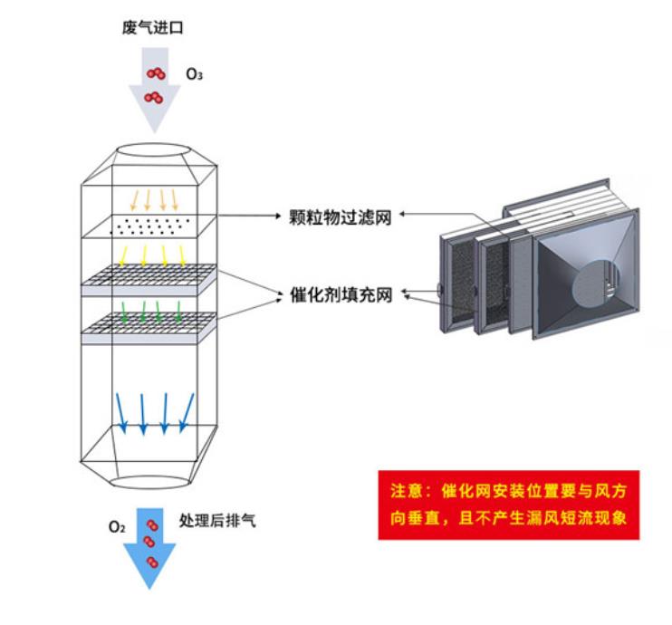 风道的设计看似与催化剂无关,但也是最容易出现问题的地方。因为只有气体有效经过臭氧催化剂,催化剂才能起到它应有的作用。好的风道设计遵循气体上进下出,不短流漏风,催化剂层数2层以上。中心思想不要漏风、不要漏风、不要漏风。