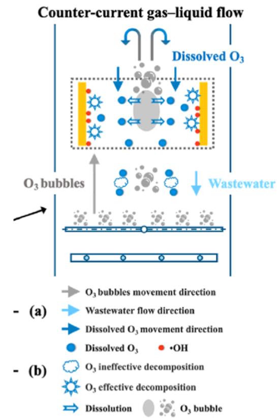 从工程工艺角度,催化剂整砌填料是反应的内因;而反应器,是催化臭氧化的外因。我曾吃惊地发现,我们对此了解得甚少,由此限制了催化臭氧化效率的提高。除氧化反应,反应器中多相变化有:一相溶解(臭氧向水相溶解);二相流动(气泡上浮、水流动);三种分解(臭氧在气相分解、在液相无效分解;在催化剂区有效分解),如图示。