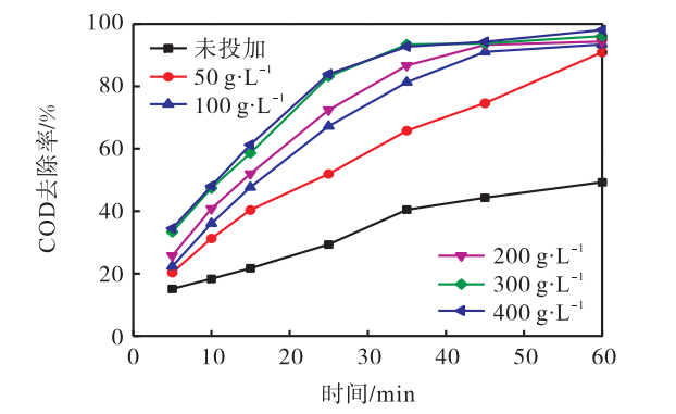 由图 1、图 2 可知:当实验室自制催化剂的投加量不断增加时,废水中 COD 及橙黄 G 的去除率逐渐升高.在 25 min 时,未投加自制催化剂情况下,废水中 COD 的去除率为 29.3% ,自制催化剂投加量分别为 50、100、200、300、400 g/L 时,废水中 COD 的去除率分别为 51.9%、67.3%、72.4%、83.2%、84.0%.分析其原因,这主要是由于随着实验室自制催化剂投加量的增加,可利用的活性位点也随着增多,臭氧分子、橙黄 G 和实验室自制催化剂碰撞机会和接触面积显著增大,臭氧得到更加充分的利用[17].但当实验室自制催化剂投加量从 300 g/L 提高至 400 g/L 时,COD 的去除率并没有显著的变化,这可能的原因是,当臭氧浓度一定时,过多的实验室自制催化剂中活性位点无法被完全占据,造成了实验室自制催化剂的浪费;也有可能是因为实验室自制催化剂投加量过高,产生的过多的羟基自由基又可以相互作用形成过氧化氢[18].实验室自制催化剂的一次性臭氧投加量选取 300 g/L。