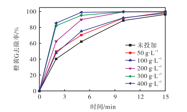 取 500 mL 质量浓度为 250 mg/L 的橙黄 G 模拟废水,臭氧的投放速率为 1.60 mg/(L·min),废水的初始 pH 为 6.5,实验室自制催化剂的一次投加量分别为 50、100、200、300、400 g/L,探究实验室自制催化剂的投加量对臭氧催化氧化橙黄 G 的影响,其实验结果如图 1、图 2 所示.