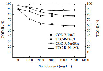 许多工业污水中往往含有一定的钠盐,为了将此工艺推广至工业应用,考察钠盐对体系降解的影响必不可少。图 为单盐(NaCl、Na2SO4)含量对水样COD和TOC去除率的影响,表 1为混合盐含量配比对水样COD和TOC去除率的影响。反应条件:COD为500 mg·L-1,进料温度为30 ℃,进料pH为11.00,催化剂用量2 g·L-1,反应时间90 min,臭氧浓度60 mg·L-1,气体流量1 L·min-1,在不同盐含量下反应并测定其COD和TOC。