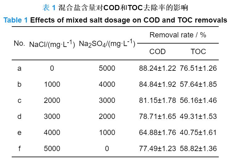 从图 和表 1可以看出,其它条件不变,NaCl的含量变化对COD和TOC去除率的影响较之Na2SO4明显很多。已有研究表明[22],溶液中的NaCl和Na2SO4会通过竞争苯酚在催化剂上的吸附位点抑制苯酚的降解过程,因此,随着盐含量的增加,COD和TOC去除率会呈现下降趋势,然而影响有限;另一方面,NaCl在水中以Na+和Cl-形态存在,Cl-为低价态阴离子,氧化还原电位低于高价态离子ClO- (E0=1.49V)会消耗体系中部分氧化剂O3 (E0=2.07 V)、OH·自由基(E0= 2.73V),从而对苯酚的降解过程产生更大抑制[23]。通过控制六组不同盐配比,可以看出,添加NaCl和Na2SO4混合盐于水样,COD和TOC去除率总体趋势随NaCl含量增加而降低,并由于溶液效应相比于仅添加NaCl时的去除率略低。